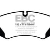 EBC Yellowstuff is an aramid fibre based brake compound with high brake effect form cold and is possibly one of the first ever compounds that can be used for STREET AND TRACK DRIVING. These pads do not require warm up but do get even stronger under the heat of hard driving. These are not a low dust pad and if your desire is for a low dust premium street use pad, you should consider EBC Redstuff.When considering full race use, Yellowstuff has been a strong favourite, having been used for two years in the Swedish Camaro Cup and at numerous other race events where a stock caliper system is fitted.It is also the choice of 90-percent of the Mazda MX5 Miata competitors in the UK race series and has an unblemished record as rotor friendly track pad for vehicles up to 2000 lbs weight or 200 BHP.In the USA the SCCA and NASA drivershave been testing Yellowstuff with feedback and good reports POURING in from a 543 test driver major market proving event with these groups. Read that figure again 543 test drivers.There is no guesswork here.