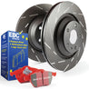 Save 15 percent over cost of buying separate parts with this quality pad and rotor kit which includes pads rotors pads rotors and caliper lube. If you drive a muscle car or premium import and require better brakes at any speed with LESS DUST this is your Kit choice. High efficiency EBC Pads built with Aramid fiber enhanced with Ceramic granules to further enhance braking,fully shimmed,slotted and chamfered and featuring the patented EBC Brake-in coating for fast pad seating after install deliver great braking power with zero brake fade. Kit includes the EBC fine slotted vented sport rotors for silent braking and cooler brakes and guaranteed flat and parallel pad wear finished with Geomet black anti rust coating.