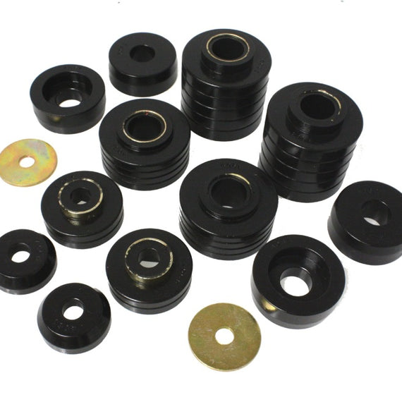 Will replace distorted and worn-out original rubber mounts to maintain car body and truck cab to bed alignment. Original rubber mounts are so soft they often crack, distort, and crush so badly they often fall off. And aluminum body mounts are too harsh for street use that they tend to break and cause other components to break. Energy's specially formulated Hyper-Flex(TM) polyurethane cab and body mounts combine the best qualities of both: they're soft enough for a smooth ride, yet rugged enough for the most demanding road or track. Most sets have a strong zinc plated steel ring molded into them - for added durability and when the application requires it.