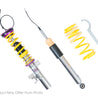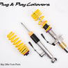 Today, more and more premium vehicles are being fitted with an electronically adaptive suspension system. Before KW DDC Plug & Play coilovers were introduced to the market, you often had to make compromises when customizing your suspension lowering, and often had to eliminate the active electronic control system and comfort features that you had paid extra for. With the adaptive KW DDC Plug & Play coilover suspensions there are no compromises to be made and you can combine the control of your standard damper system with a seamless suspension lowering and the driving dynamics tuned by KW suspensions experienced engineers. During installation, the factory electronic struts are simply replaced by KW INOX-LINE stainless steel coilover struts and the adaptive KW dampers are connected to the on-board electronics using your vehicles original plugs. Fitting a KW DDC Plug & Play coilover suspension requires no further modifications. The standard dampers can simply be replaced with the KW DDC (Dynamic Damping Control) coilover kit. The existing controls and the button installed in the vehicle interior for the operation of the damper control will now operate the KW DDC Plug & Play coilovers. For the first time, the KW DDC Plug & Play coilover kit combines the advantages of a KW coilover suspension with the convenience of the standard electronic damper controls. At the push of a button, the driver can choose between the Comfort, Normal and Sport setup optimized for the KW coilover suspension. In addition, the KW coilover suspension allows individual ride height adjustability within the tested Adjustment -ange. Our original equipment quality suspension technology -s compatible with various vehicle manufacturers. As a result, the adaptive KW DDC suspension is instantly recognized by the on-board electronics. So all the displays and controls of your factory vehicle remain fully functional but you get a completely new driving experience.