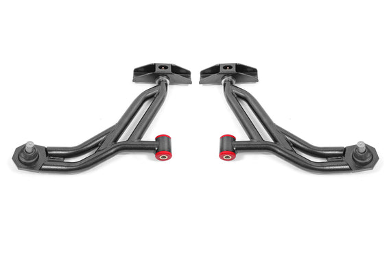 A-arms are one of the most important, yet overlooked suspension components. They are the direct link between the front wheels and the chassis. Any deflection causes a change in alignment, which results in poor performance and driving feel. Fabricated from heavy-duty 1.25-inch, 0.120-inch wall DOM tubing, deflection is eliminated with A-arms from BMR Suspension. BMR?s AA755 Lower A-arms are equipped with greasable heavy-duty ball joints, greasable Delrin bushings (rear mount) to handle the high loads, and zinc-plated, X-series, heat-treated, chrome-moly, self-lubricating, Teflon-lined rod ends for loads of adjustability. Solid mounts give you a more responsive feel over the stock rubber bushings. BMR?s bushings allow grease to evenly coat the inner sleeve. This efficient lubrication ensures quiet, reliable operation over the life of the bushings. The combination of rod ends and Delrin bushings gives you improved steering feel and responsiveness for any for of driving.