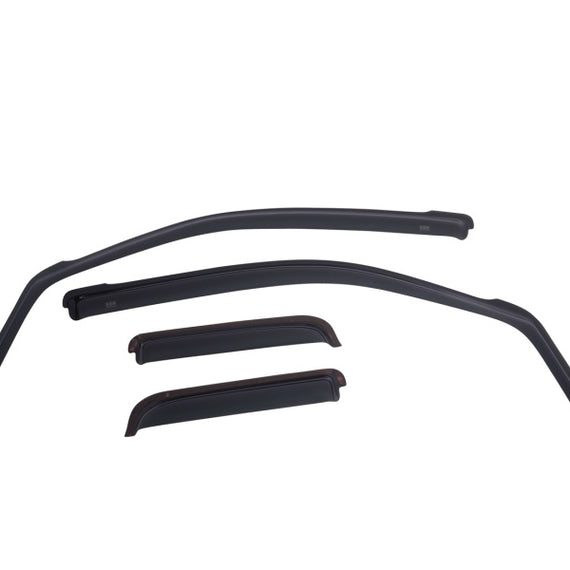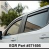 EGR MATTE BLACK In-Channel Window Visors are designed to promote fresh air circulation inside the vehicle. These fully integrated, custom molded designs help to reduce windshield fogging in wet weather for safer driving, and can lower interior temperatures in parked vehicles. The UV protected finish is easy to clean.. Limited lifetime warranty. FRONT & REAR SET.