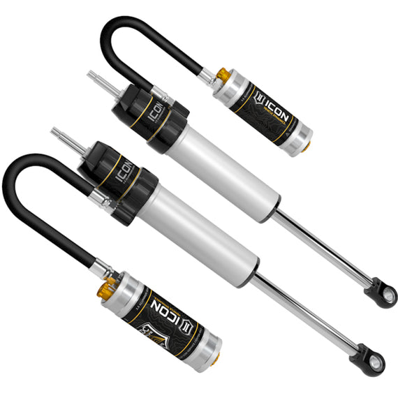 ICON’s 2.5 Aluminum Series shocks shocks are designed and built to give your vehicle outstanding performance off-road and a smooth ride on the street. These shocks are configured specifically for each application in both length and damping tune. Featuring one-piece impact extruded aluminum cylinders, these 2.5 Aluminum Series shocks offer lighter weight, improved corrosion resistance, and a more uniform finish than traditional plated steel cylinders. Like all ICON'S Shock Absorbers, 2.5 Aluminum Series shocks are 100% rebuildable and 100% revalveable. For piggyback and specific remote reservoir applications, ICON'S unique use of a 6061 billet aluminum manifold a few inches below the top cap of the shock creates an internal Bump Zone that when used creates an additional 20% of damping force. This additional force helps prevent harsh bottom outs and controls the suspension when compressing at high velocity. The ICON CDC Valve is an externally adjustable valve that restri cts oil flow into the reservoir which creates 10 levels of compression damping force ranges. If you are looking for a more user defined tune, consider looking into the Omega Series bypass shocks.