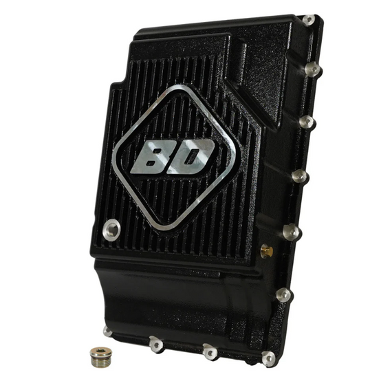 High volumes of cool oil equate to long transmission life. BD's transmission pans increase oil capacity, while aluminum construction and heat-dissipating fins keep the temperature down. As an added bonus, the pan's increased rigidity prevents case twisting. The kit includes a temperature port plug and a magnetic drain plug.