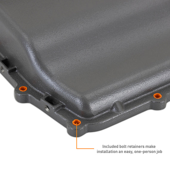 This Mishimoto Aluminum Transmission Pan is a direct-fit, high-performance upgrade for your Ford 10R60/10R80 transmission in your Bronco, Ranger, F-150, or Mustang. Cast from high-quality aluminum and powder coated Gunmetal Gray, our transmission pan is a robust and long-lasting upgrade for your vehicle's transmission. With a sleek design and bottom ribs, this pan not only adds to the overall aesthetic of your vehicle but also provides improved cooling performance.----This transmission pan features internal baffles that reduce sloshing and enhance heat dissipation, resulting in smoother transmission performance. All the headaches that come with a flat gasket and messy sealants are eliminated with our precision-machined dovetail-style groove and O-ring seal. This groove positively retains the O-ring, so you never have to worry about it falling out of place during installation. Additionally, the Mishimoto Ford 10R60/10R80 Aluminum Transmission Pan adds an extra 2 quarts of ATF to help maintain optimal transmission operation.----Fed up with the frustration of trying to hold up a transmission pan with one hand while threading the fasteners in with the other? Mishimoto has you covered with pre-installed bolt retainers that hold the fasteners in the pan, allowing you to easily thread the bolts without dropping them on the ground, your head, or worse, that pan of nasty transmission fluid you just drained. Additionally, our pan comes equipped with a magnetic drain plug for easy draining and a 1/8-inch NPT port and plug for temperature sensors to make servicing your transmission and monitoring temperatures a breeze.----This direct-fit upgrade offers affordable durability and helps maintain smooth transmission operation, ensuring a long life for your transmission. Like all Mishimoto products, this transmission pan is backed by the Mishimoto Lifetime Warranty.